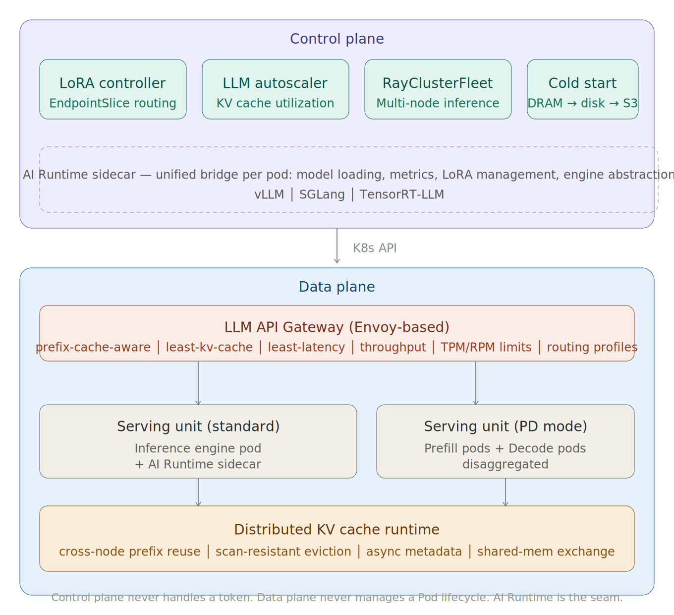 Runs a unified sidecar (AI Runtime) so the control plane doesn't need to know whether you're using vLLM, SGLang, or TensorRT-LLM