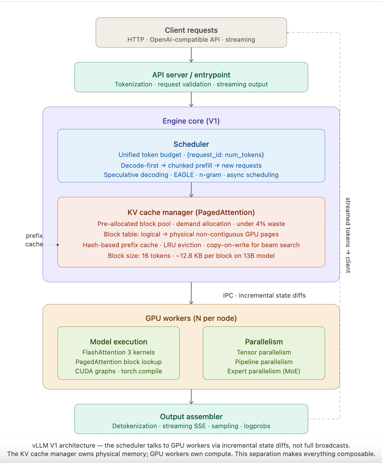 Caption: V1 engine architecture, the scheduler talks to GPU workers via incremental state diffs, not full state broadcasts. The KV cache manager owns physical memory allocation; GPU workers own compute. This separation is what makes chunked prefill and prefix caching composable.